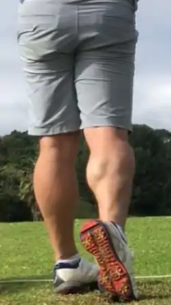 The calf (pl.: calves; Latin: sura) is the back portion of the lower leg in human anatomy.[1] The muscles within the calf correspond to the posterior compartment of the leg. The two largest muscles within this compartment are known together as the calf muscle and attach to the heel via the Achilles tendon. Several other, smaller muscles attach to the knee, the ankle, and via long tendons to the toes.