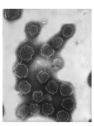 Transmission electron microscopy photograph of California encephalitis virus virions | |