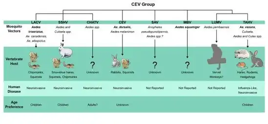 Transmission of the virus occurs via Aedes. triseriatus, Aedes. albopictus and Aedes japonicus as vectors[10]