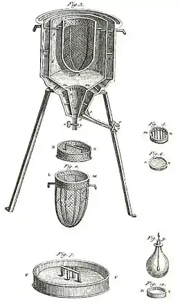 An early calorimeter was that used by Laplace and Lavoisier, as shown in the figure above. It worked at constant temperature, and at atmospheric pressure. The latent heat involved was then not a latent heat with respect to volume or with respect to pressure, as in the above account for calorimetry without phase change. The latent heat involved in this calorimeter was with respect to phase change, naturally occurring at constant temperature. This kind of calorimeter worked by measurement of mass of water produced by the melting of ice, which is a phase change.
