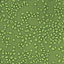 Candida glabrata is a species of haploid yeast of the genus Candida, previously known as Torulopsis glabrata. Despite the fact that no sexual life cycle has been documented for this species, C. glabrata strains of both mating types are commonly found.[1] C. glabrata is generally a commensal of human mucosal tissues, but in today's era of wider human immunodeficiency from various causes (for example, therapeutic immunomodulation, longer survival with various comorbidities such as diabetes, and HIV infection), C. glabrata is often the second or third most common cause of candidiasis as an opportunistic pathogen.[2] Infections caused by C. glabrata can affect the urogenital tract or even cause systemic infections by entrance of the fungal cells in the bloodstream (Candidemia), especially prevalent in immunocompromised patients.[2]