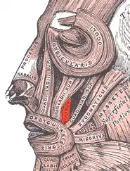 The canine space (also termed the infra-orbital space),[1] is a fascial space of the head and neck (sometimes also termed fascial spaces or tissue spaces). It is a thin potential space on the face, and is paired on either side. It is located between the levator anguli oris muscle inferiorly and the levator labii superioris muscle superiorly.[1][2] The term is derived from the fact that the space is in the region of the canine fossa, and that infections originating from the maxillary canine tooth may spread to involve the space. Infra-orbital is derived from infra- meaning below and orbit which refers to the eye socket.