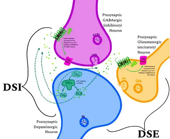 In the brain, the canonical mechanism of CB1 receptor activation is a form of short-term synaptic plasticity initiated via retrograde signaling of endogenous CB1 agonists such as 2AG or AEA (two primary endocannabinoids). This mechanism of action is called depolarization-induced suppression of inhibition (DSI) or depolarization-induced suppression of excitation (DSE),[21] depending on the classification of the presynaptic neuron acted upon by the retrograde messenger (see diagram at left). In the case of CB1R agonism on the presynaptic membrane of a GABAergic interneuron, activation leads to a net effect of increased activity, while the same activity on a glutamatergic neuron leads to the opposite net effect. The release of other neurotransmitters is also modulated in this way, particularly dopamine, dynorphin, oxytocin, and vasopressin.[21]