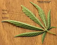 Underside of Cannabis sativa leaf, showing diagnostic venation
