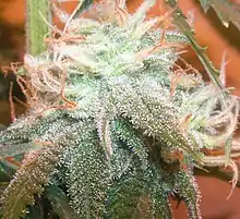 Cannabinoids, terpenes, terpenoids, and other compounds are secreted by glandular trichomes that occur most abundantly on the floral calyxes and bracts of female plants.[42]