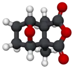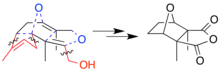 Cantharidin, from the Greek kantharis, for beetle,[2] is an odorless, colorless natural product with solubility in various organic solvents, but only slight solubility in water.[3] Its skeleton is tricyclic, formally, a tricyclo-[5.2.1.02,6]decane skeleton. Its functionalities include a carboxylic acid anhydride (−CO−O−CO−) substructure in one of its rings, as well as a bridging ether in its bicyclic ring system.
