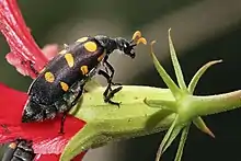 - ↑ Including broadly in genus Epicauta, genus Berberomeloe, and in species Lytta vesicatoria (Spanish fly). False blister beetles, cardinal beetles, and soldier beetles also produce cantharidin.
