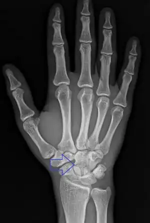 Capitate fracture is a break of the capitate bone in the wrist. Symptoms typically include pain and swelling of the wrist.[1] Often there are other wrist bone fractures or joint dislocations.[1] Complications may include arthritis and avascular necrosis.[1]