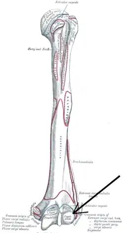 In birds, where forelimb anatomy has an adaptation for flight, its functional if not[1] ontogenetic equivalent is the dorsal condyle of the humerus.