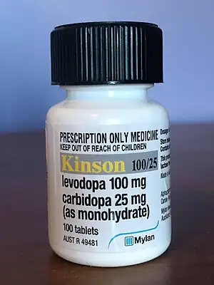 ![]() Bottle of carbidopa (25 mg) / levodopa (100 mg) in Australia. | |
