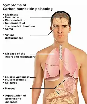 - 1 2 Olson KR (1984). "Carbon monoxide poisoning: Mechanisms, presentation, and controversies in management". The Journal of Emergency Medicine. 1 (3): 233–43. doi:10.1016/0736-4679(84)90078-7. PMID 6491241.