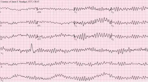 Sudden cardiac arrest (SCA) and sudden cardiac death (SCD) occur when the heart abruptly begins to beat in an abnormal or irregular rhythm (arrhythmia).[20] Without organized electrical activity in the heart muscle, there is no consistent contraction of the ventricles, which results in the heart's inability to generate an adequate cardiac output (forward pumping of blood from heart to rest of the body).[21] There are many different types of arrhythmias, but the ones most frequently recorded in SCA and SCD are ventricular tachycardia (VT) or ventricular fibrillation (VF).[22] Less common causes of dysrhythmias in cardiac arrest include pulseless electrical activity (PEA) or asystole.[20] Such rhythms are seen when there is prolonged cardiac arrest, progression of ventricular fibrillation, or due to efforts such as defibrillation to resuscitate the person.[20]