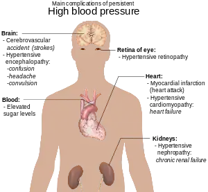 Complications of hypertension are clinical outcomes that result from persistent elevation of blood pressure.[34] Hypertension is a risk factor for all clinical manifestations of atherosclerosis since it is a risk factor for atherosclerosis itself.[35][36][37][38][39] It is an independent predisposing factor for heart failure,[40][41] coronary artery disease,[42][43] stroke,[34] renal disease,[44][45][46] and peripheral arterial disease.[47][48] It is the most important risk factor for cardiovascular morbidity and mortality, in industrialized countries.[49]