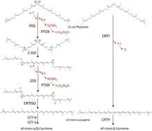- ↑ Armstrong GA, Hearst JE (1996). "Carotenoids 2: Genetics and molecular biology of carotenoid pigment biosynthesis". FASEB J. 10 (2): 228–37. doi:10.1096/fasebj.10.2.8641556. PMID 8641556. S2CID 22385652.