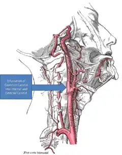 Carotidynia is a syndrome characterized by unilateral (one-sided) tenderness of the carotid artery, near the bifurcation. It was first described in 1927 by Temple Fay.[1] The most common cause of carotidynia may be migraine, and then it is usually self-correcting. Common migraine treatments may help alleviate the carotidynia symptoms. Recent histological evidence has implicated an inflammatory component of carotidynia, but studies are limited.[2] Carotid arteritis is a much less common cause of carotidynia, but has much more serious consequences. It is a form of giant cell arteritis, which is a condition that usually affects arteries in the head. Due to this serious condition possibly causing carotidynia, and the possibility that neck pain is related to some other non-carotidynia and serious condition, the case should be investigated by a medical doctor.[3] Because carotidynia can be caused by numerous causes, Biousse and Bousser in 1994 recommended the term not be used in the medical literature.[4] However, recent MRI and ultrasound studies have supported the existence of a differential diagnosis of carotidynia consistent with Fay's characterization.[5][6]