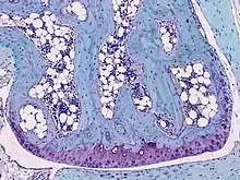 Cartilage is a resilient and smooth type of connective tissue. It is a semi-transparent and non-porous type of tissue. It is usually covered by a tough and fibrous membrane called perichondrium. In tetrapods, it covers and protects the ends of long bones at the joints as articular cartilage,[1] and is a structural component of many body parts including the rib cage, the neck and the bronchial tubes, and the intervertebral discs. In other taxa, such as chondrichthyans, but also in cyclostomes, it may constitute a much greater proportion of the skeleton.[2] It is not as hard and rigid as bone, but it is much stiffer and much less flexible than muscle. The matrix of cartilage is made up of glycosaminoglycans, proteoglycans, collagen fibers and, sometimes, elastin. It usually grows quicker than bone.