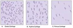 There are three different types of cartilage: elastic (A), hyaline (B), and fibrous (C). In elastic cartilage, the cells are closer together creating less intercellular space. Elastic cartilage is found in the external ear flaps and in parts of the larynx. Hyaline cartilage has fewer cells than elastic cartilage; there is more intercellular space. Hyaline cartilage is found in the nose, ears, trachea, parts of the larynx, and smaller respiratory tubes. Fibrous cartilage has the fewest cells so it has the most intercellular space. Fibrous cartilage is found in the spine and the menisci.