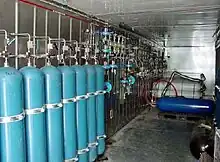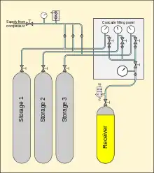 A cascade filling system is a high-pressure gas cylinder storage system that is used for the refilling of smaller compressed gas cylinders.[1][2] In some applications, each of the large cylinders is filled by a compressor, otherwise they may be filled remotely and replaced when the pressure is too low for effective transfer. The cascade system allows small cylinders to be filled without a compressor. In addition, a cascade system is useful as a reservoir to allow a low-capacity compressor to meet the demand of filling several small cylinders in close succession, with longer intermediate periods during which the storage cylinders can be recharged.
