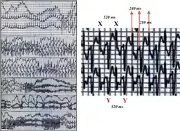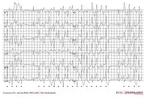 In those with CPVT, catecholamine release can lead to an abnormal heart rhythm or arrhythmia known as ventricular tachycardia.[4] The ventricular tachycardia may take a characteristic form known as bidirectional ventricular tachycardia. This form of ventricular tachycardia occurs relatively infrequently, but if seen is suggestive of an underlying diagnosis of CPVT or the related condition Andersen-Tawil syndrome.[8][9] These ventricular arrhythmias in some cases terminate by themselves, causing a blackout from which the person then recovers. However, if the abnormal heart rhythm continues, it can degenerate into a more dangerous arrhythmia known as ventricular fibrillation causing a cardiac arrest and, if untreated, sudden death.[10]