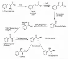 The synthesis of cathinone in khat begins with L-phenylalanine and the first step is carried out by L-phenylalanine ammonia lyase (PAL), which cleaves off an ammonia group and creates a carbon-carbon double bond, forming cinnamic acid.[16] After this, the molecule can either go through a beta-oxidative pathway or a non-beta-oxidative pathway. The beta-oxidative pathway produces benzoyl-CoA while the non-beta-oxidative pathway produces benzoic acid.[16] Both of these molecules can be converted to 1-phenylpropane-1,2-dione by a condensation reaction catalyzed by a ThDP-dependent enzyme (Thiamine diphosphate-dependent enzyme) with pyruvate and producing CO2.[16] 1-phenylpropane-1,2-dione goes through a transaminase reaction to replace a ketone with an ammonia group to form (S)-cathinone. (S)-Cathinone can then undergo a reduction reaction to produce the less potent but structurally similar cathine or norephedrine, which are also found in the plant.[16]