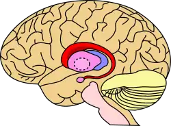 The caudate nucleus is one of the structures that make up the corpus striatum, which is a component of the basal ganglia in the human brain.[1] While the caudate nucleus has long been associated with motor processes due to its role in Parkinson's disease,[2][3] it plays important roles in various other nonmotor functions as well, including procedural learning,[4] associative learning[5] and inhibitory control of action,[6] among other functions. The caudate is also one of the brain structures which compose the reward system and functions as part of the corticobasal gangliathalamic loop.[1]