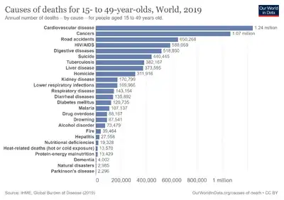 Loneliness or insufficient social relationships is also a major underlying factor, which may be comparable to smoking and, according to one meta-analysis of 148 studies, "exceeds many well-known risk factors for mortality (e.g., obesity, physical inactivity)".[60] Injuries and violence are "the leading causes of death among children, adolescents, and young adults in the US" with underlying risk factors for such including "detrimental community, family, or individual circumstances" that increase the likelihood of violence. Types of preventive measures may include support of "healthy development of individuals, families, schools, and communities, and build[ing] capacity for positive relationships and interactions".[61]