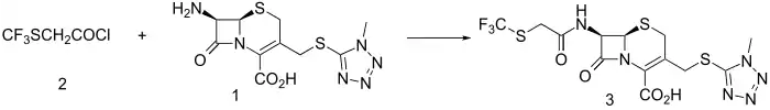 Cefazaflur is synthesized by reaction of 3-(1-methyl-1H-tetrazol-5-ylthiomethylene)-7-amino-cephem-4-carboxylic acid (1) with trifluoromethylthioacetyl chloride (2).
