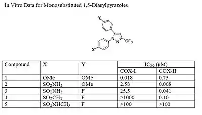 - 1 2 3 Penning TD, Talley JJ, Bertenshaw SR, Carter JS, Collins PW, Docter S, Graneto MJ, Lee LF, Malecha JW, Miyashiro JM, Rogers RS, Rogier DJ, Yu SS, Burton EG, Cogburn JN, Gregory SA, Koboldt CM, Perkins WE, Seibert K, Veenhuizen AW, Zhang YY, Isakson PC (April 1997). "Synthesis and biological evaluation of the 1,5-diarylpyrazole class of cyclooxygenase-2 inhibitors: identification of 4-[5-(4-methylphenyl)-3-(trifluoromethyl)-1H-pyrazol-1-yl]benze nesulfonamide (SC-58635, celecoxib)". Journal of Medicinal Chemistry. 40 (9): 1347–65. doi:10.1021/jm960803q. PMID 9135032.