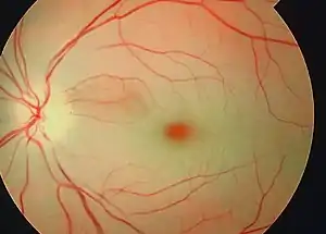 Cherry red spot in a person with central retinal artery occlusion | |