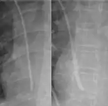 - ↑ Venugopal AN, Koshy RC, Koshy SM (July 2013). "Role of chest X-ray in citing central venous catheter tip: A few case reports with a brief review of the literature". Journal of Anaesthesiology Clinical Pharmacology. 29 (3): 397–400. doi:10.4103/0970-9185.117114. PMC 3788245. PMID 24106371.