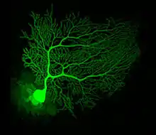 Purkinje cells are among the most distinctive neurons in the brain, and one of the earliest types to be recognized—they were first described by the Czech anatomist Jan Evangelista Purkyně in 1837. They are distinguished by the shape of their dendritic tree: the dendrites branch very profusely, but are severely flattened in a plane perpendicular to the cerebellar folds. Thus, the dendrites of a Purkinje cell form a dense planar net, through which parallel fibers pass at right angles.[9] The dendrites are covered with dendritic spines, each of which receives synaptic input from a parallel fiber. Purkinje cells receive more synaptic inputs than any other type of cell in the brain—estimates of the number of spines on a single human Purkinje cell run as high as 200,000.[9] The large, spherical cell bodies of Purkinje cells are packed into a narrow layer (one cell thick) of the cerebellar cortex, called the Purkinje layer. After emitting collaterals that affect nearby parts of the cortex, their axons travel into the deep cerebellar nuclei, where they make on the order of 1,000 contacts each with several types of nuclear cells, all within a small domain. Purkinje cells use GABA as their neurotransmitter, and therefore exert inhibitory effects on their targets.[9]