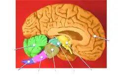 ![]() Angle shown between cerebellum (bright green) and pons (beige) as it meets from the cerebrum | |