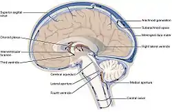 In humans, there is about 125–150 mL of CSF at any one time.[1] This CSF circulates within the ventricular system of the brain. The ventricles are a series of cavities filled with CSF. The majority of CSF is produced from within the two lateral ventricles. From here, CSF passes through the interventricular foramina to the third ventricle, then the cerebral aqueduct to the fourth ventricle. From the fourth ventricle, the fluid passes into the subarachnoid space through four openings  the central canal of the spinal cord, the median aperture, and the two lateral apertures.[1] CSF is present within the subarachnoid space, which covers the brain and spinal cord, and stretches below the end of the spinal cord to the sacrum.[1][2] There is a connection from the subarachnoid space to the bony labyrinth of the inner ear making the cerebrospinal fluid continuous with the perilymph in 93% of people.[3]