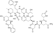Ceruletide (INN), also known as cerulein or caerulein, is a ten amino acid oligopeptide that stimulates smooth muscle and increases digestive secretions. Ceruletide is similar in action and composition to cholecystokinin. It stimulates gastric, biliary, and pancreatic secretion; and certain smooth muscle. It is used in paralytic ileus and as diagnostic aid in pancreatic malfunction. It is used to induce pancreatitis in experimental animal models.