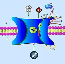 This diagram of a NMDA receptor shows the binding points for a diverse array of molecules which can affect the receptor function. Legend: 1. Cell membrane 2. Channel blocked by Mg2+ at the block site (3) 3. Block site by Mg2+ 4. Hallucinogen compounds binding site 5. Binding site for Zn2+ 6. Binding site for agonists(glutamate) and/or antagonist ligands(APV) 7. Glycosylation sites 8. Proton binding sites 9. Glycine binding sites 10. Polyamines binding site 11. Extracellular space 12. Intracellular space