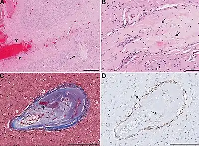 a) Charcot–Bouchard aneurysm in superficial cortical layer b) higher magnification of CBA with fibrosis and foamy macrophages c) CBA in the mid cortex, trichrome stains collagen blue and focal fibrin red d) CD163 immunostain highlights macrophages surrounding and within the CBA | |