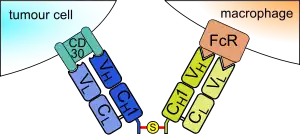 Example of chemically linked Fabs: two Fab' fragments linked with a thioether, resulting in a F(ab')2. The molecule is bound to a tumour cell via the tumour antigen CD30 and to a macrophage via an Fc receptor.