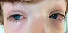 Chemosis is the swelling (or edema) of the conjunctiva. The term derives from the Greek words cheme and -osis, cheme meaning cockleshell due to the swollen conjunctiva resembling it, and -osis meaning condition.[1] The swelling is due to the oozing of exudate from abnormally permeable capillaries. In general, chemosis is a nonspecific sign of eye irritation. The outer surface covering appears to have fluid in it. The conjunctiva becomes swollen and gelatinous in appearance. Often, the eye area swells so much that the eyes become difficult or impossible to close fully.[2] Sometimes, it may also appear as if the eyeball has moved slightly backwards from the white part of the eye due to the fluid filled in the conjunctiva all over the eyes except the iris. The iris is not covered by this fluid and so it appears to be moved slightly inwards.