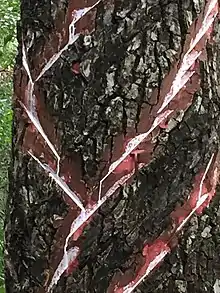 Although chewing gum can be traced back to civilizations worldwide, the modernization and commercialization of this product mainly took place in the United States. The American Indians chewed resin made from the sap of spruce trees.[11] The New England settlers picked up this practice, and in 1848, John B. Curtis developed and sold the first commercial chewing gum called The State of Maine Pure Spruce Gum. In this way, the industrializing West, having forgotten about tree gums, rediscovered chewing gum through the First Americans. Around 1850 a gum made from paraffin wax, a petroleum product, was developed and soon exceeded the spruce gum in popularity. To sweeten these early gums, the chewer would often make use of a plate of powdered sugar, which they would repeatedly dip the gum in to maintain sweetness.[12] William F. Semple, a dentist from Mount Vernon, Ohio, filed an early patent on chewing gum, patent number 98,304, on 28 December 1869.[13] Semple's gum was intended to clean the teeth and strengthen the chewer's jaw. It was not a sweet treat; ingredients included chalk and powdered licorice root. Charcoal was also suggested as a "suitable" ingredient in the patent.[14]