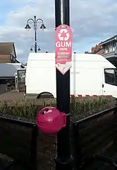 In 2018, the BBC published a news article on British designer Anna Bullus, who created a method of collecting and recycling chewing gum into plastic, noting that litter from chewing gum is the second most common form of litter, second only to cigarette litter. She uses a Worcester recycling plant to make old chewing gum into plastic. She then uses that plastic at a plastic moulding specialist, Amber Valley, in Leicester to make plastic objects. Known objects made are collection containers for more chewing gum, shoe soles, rubber boots, and plastic cups.[73] Her company advertises itself as the "first company in the world to recycle and process chewing gum into a range of new compounds that can be used in the rubber and plastics industry". The company is called Gum-tec, and the collection containers are dubbed "gumdrops". Advertised products on the website are pencils, coffee mugs, guitar picks, a "bicycle spoke", rulers, sports cones, frisbees, boomerangs, door stops, "meal mates", lunch-boxes, and combs.[74]
