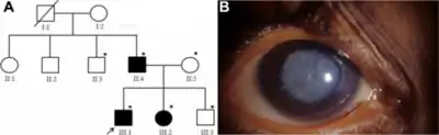 a) Juvenile cataract affected family shows autosomal dominant mode of transmission with three affected individuals b)image of an individual with anterior polar coronary cataract phenotype is shown | |