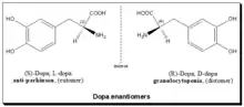 The initial use of racemic dopa for the treatment of Parkinson's disease resulted in a number of adverse effects viz. nausea, vomiting, anorexia, involuntary movements and granulocytopenia. The use of L-dopa [the (S)-enantiomer] resulted in reducing the required dose, and adverse effects. The granulocytopenia was not observed with the single enantiomer.[48][49][50]