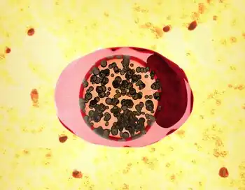 Like other Chlamydia species, C. trachomatis has a life cycle consisting of two morphologically distinct forms. First, C. trachomatis attaches to a new host cell as a small spore-like form called the elementary body.[5] The elementary body enters the host cell, surrounded by a host vacuole, called an inclusion.[5] Within the inclusion, C. trachomatis transforms into a larger, more metabolically active form called the reticulate body.[5] The reticulate body substantially modifies the inclusion, making it a more hospitable environment for rapid replication of the bacteria, which occurs over the following 30 to 72 hours.[5] The massive number of intracellular bacteria then transition back to resistant elementary bodies, before causing the cell to rupture and being released into the environment.[5] These new elementary bodies are then shed in the semen or released from epithelial cells of the female genital tract, and attach to new host cells.[6]