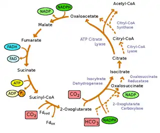 - 1 2 3 4 5 6 7 8 Tang KH, Blankenship RE (November 2010). "Both forward and reverse TCA cycles operate in green sulfur bacteria". The Journal of Biological Chemistry. 285 (46): 35848–54. doi:10.1074/jbc.M110.157834. PMC 2975208. PMID 20650900.