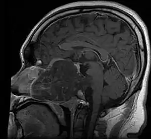 MRI of extensive clival chordoma in 17-year-old male patient, axial view. Tumor in the nasopharynx extending from nasal cavity to brainstem posteriorly is clearly visible. | |