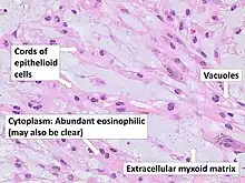 - The histological appearance of classical chordoma is of a lobulated tumor composed of groups of cells separated by fibrous septa. The cells have small round nuclei and abundant vacuolated cytoplasm, sometimes described as physaliferous (having bubbles or vacuoles).