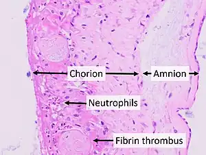 Micrograph of acute chorioamnionitis, with neutrophils in the chorion. Also seen are fibrin clots, indicating a severe fetal inflammatory response.[1] H&E stain. | |