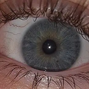 Choroidal nevus (plural: nevi) is a type of eye neoplasm that is classified under choroidal tumors as a type of benign (non-cancerous) melanocytic tumor.[1] A choroidal nevus can be described as an unambiguous pigmented blue or green-gray choroidal lesion, found at the front of the eye, around the iris,[2] or the rear end of the eye.[3][4]