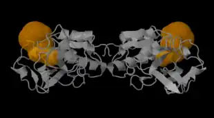 Chymopapain presents a quaternary structure characterized by the formation of homo dimers, which means that two chymopapain chains join each other through weak interactions to conform one unique biological structure.[10]