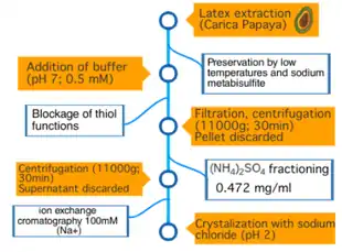 - 1 2 3 Azarkan M, El Moussaoui A, van Wuytswinkel D, Dehon G, Looze Y (June 2003). "Fractionation and purification of the enzymes stored in the latex of Carica papaya". Journal of Chromatography. B, Analytical Technologies in the Biomedical and Life Sciences. 790 (1–2): 229–238. doi:10.1016/s0021-9673(02)01534-0. PMID 12767335.